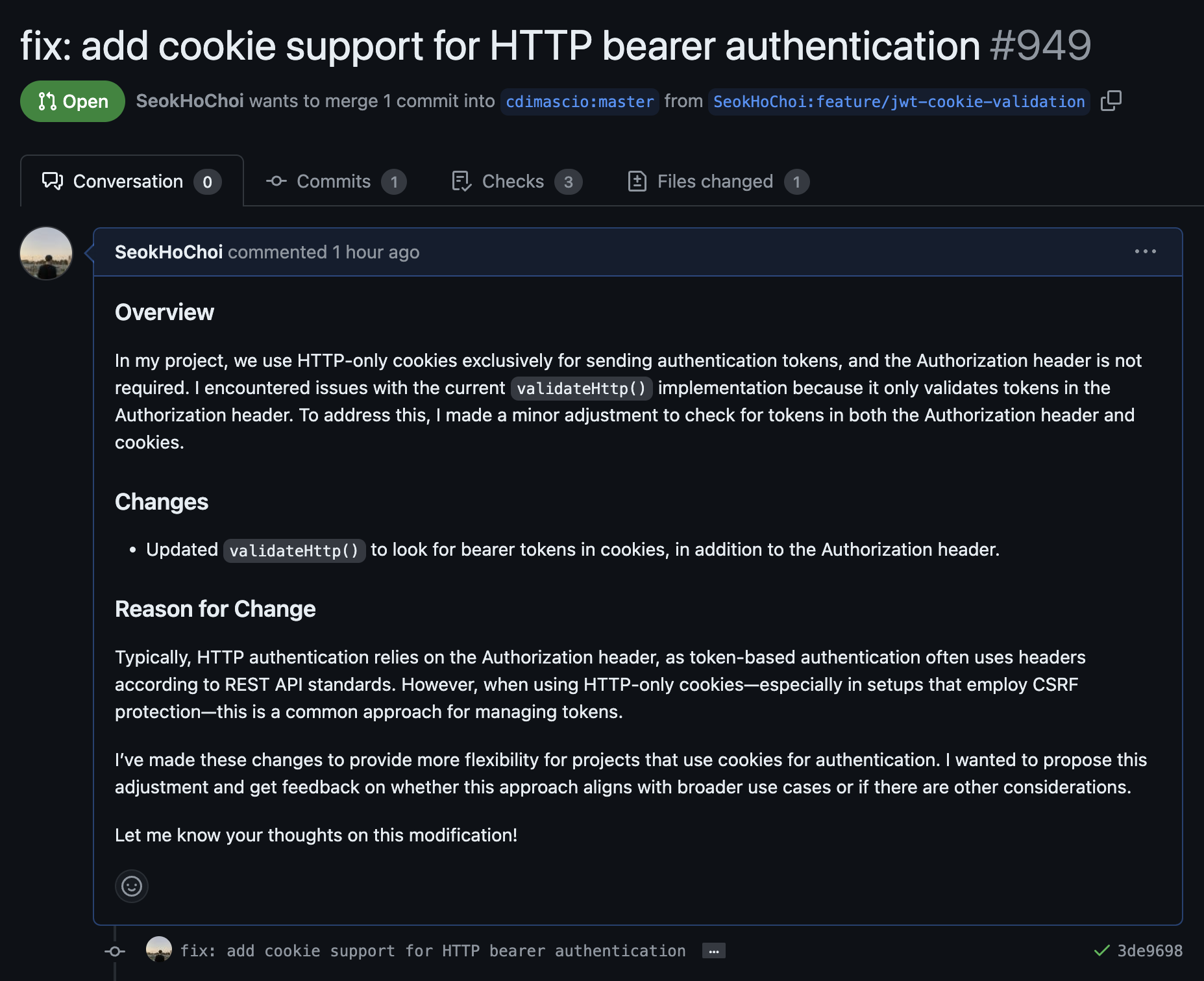 ์ ๊ฐ ์๊ฐํ ๋ฐฉ์์ด ๋ง๋์ง, ๋์น ๋ถ๋ถ์ ์๋์ง ๊ฒํ ํ๊ธฐ ์ํด validateHttp ๋ฉ์๋๋ฅผ ์์ ํ PR์ ๋จ๊ฒจ๋ ์ํ์